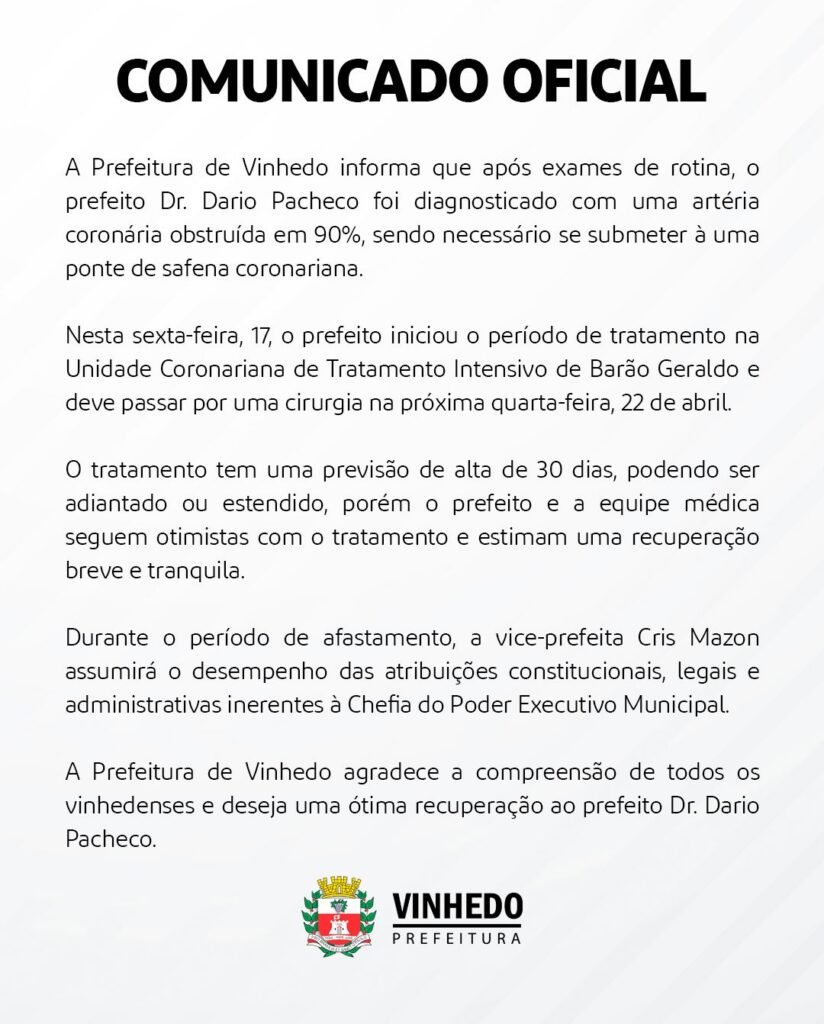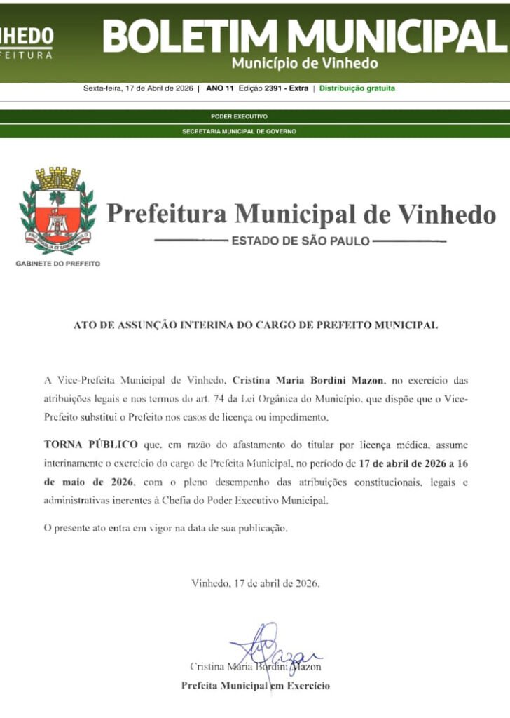 O prefeito de Vinhedo, Dr. Dario, se afastou temporariamente do cargo por licença médica, conforme ato publicado no Boletim Municipal desta sexta-feira (17). Com isso, a vice-prefeita Cristina Maria Bordini Mazon assume interinamente a chefia do Executivo no período de 17 de abril a 16 de maio de 2026. O afastamento foi repentino e a Prefeitura ainda não informou o estado de saúde do prefeito.