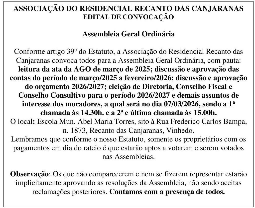 EDITAL DE CONVOCAÇÃO – ASSOCIAÇÃO DO RESIDENCIAL RECANTO DAS CANJARANAS EDITAL Published: fevereiro 21, 2026 Reading time: Less than 1 min. FacebookTwitterPinterestWhatsApp Tags:3 FacebookTwitterPinterestWhatsApp Jornal de Vinhedo Notícias relacionadas EDITAL CONDOMÍNIO VINHAS DA VISTA ALEGRE EDITAL fevereiro 23, 2026 EDITAL CLUBE VINHAS DA VISTA ALEGRE EDITAL fevereiro 23, 2026 EDITAL DE CONVOCAÇÃO TERRAS DE VINHEDO EDITAL fevereiro 21, 2026 CONVOCAÇÃO PARA RETORNAR AS ATIVIDADES LABORAIS EDITAL dezembro 11, 2025 Últimas notícias EDITAL CONDOMÍNIO VINHAS DA VISTA ALEGRE EDITAL fevereiro 23, 2026 EDITAL CLUBE VINHAS DA VISTA ALEGRE EDITAL fevereiro 23, 2026 Furto de cabos deixa UBS Casa Verde sem energia e atendimento é suspenso em Vinhedo Vinhedo fevereiro 23, 2026 Nascimento completa 40 anos na Guarda Municipal de Vinhedo Vinhedo fevereiro 23, 2026