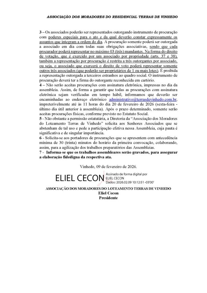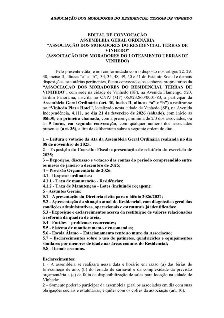 EDITAL DE CONVOCAÇÃO TERRAS DE VINHEDO EDITALSem categoria Published: fevereiro 21, 2026 Reading time: Less than 1 min. FacebookTwitterPinterestWhatsApp FacebookTwitterPinterestWhatsApp Jornal de Vinhedo Notícias relacionadas EDITAL CONDOMÍNIO VINHAS DA VISTA ALEGRE EDITAL fevereiro 23, 2026 EDITAL CLUBE VINHAS DA VISTA ALEGRE EDITAL fevereiro 23, 2026 EDITAL DE CONVOCAÇÃO – ASSOCIAÇÃO DO RESIDENCIAL RECANTO DAS CANJARANAS EDITAL fevereiro 21, 2026 Pista de patinação no gelo é atração das férias no Maxi Shopping Sem categoria dezembro 16, 2025 Últimas notícias EDITAL CONDOMÍNIO VINHAS DA VISTA ALEGRE EDITAL fevereiro 23, 2026 EDITAL CLUBE VINHAS DA VISTA ALEGRE EDITAL fevereiro 23, 2026 Furto de cabos deixa UBS Casa Verde sem energia e atendimento é suspenso em Vinhedo Vinhedo fevereiro 23, 2026 Nascimento completa 40 anos na Guarda Municipal de Vinhedo Vinhedo fevereiro 23, 2026