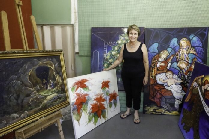 Há poucos dias do Natal, crianças, jovens e adultos decoram um pinheiro com luzes, estrelas, sonhos e esperança. Com esta cena e tantas outras, Marisa Solimeo eterniza as celebrações natalinas na exposição de arte “Noite Feliz”, que abre visitação a partir desta sexta-feira, 1º, no Memorial do Imigrante ‘Tuto Gasparini’, uma das programações do ‘Natal Família’, organizado pela Prefeitura de Vinhedo, por meio da Secretaria de Cultura e Turismo.