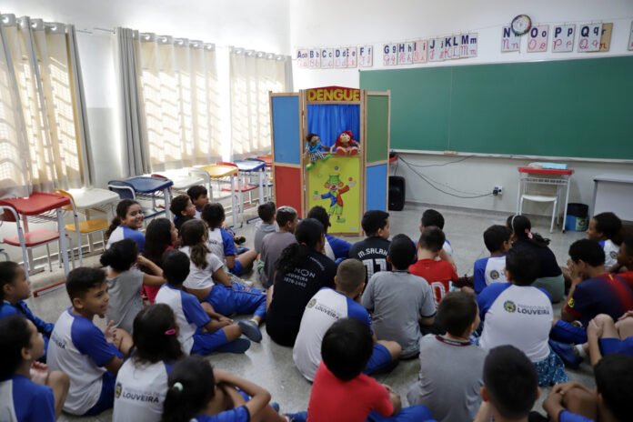 Em ação simultânea com as sete cidades da Região Metropolitana de Jundiaí (RMJ), Dia D de Combate à Dengue em Louveira inicia com apresentação de peça teatral para as crianças da Escola Fundamental Ceil Bairro. Com o nome “A Mosquita ZzzzorAedes”, a peça tem o objetivo de ensinar, de forma divertida, as crianças como o mosquito da dengue se prolifera e quais os seus criadouros nas moradias.
