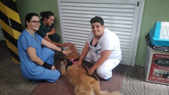 Duas cachorras Golden retriever (Aurora e Phoebe) percorreram os quartos, os corredores e diversos setores do hospital, dando e recebendo carinho ao longo do percurso.