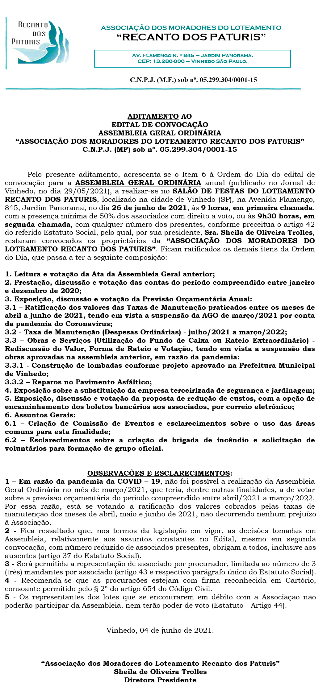 VinhedoEDITAL Aditamento do Edital da AGO Recanto dos Paturis 9 de junho de 2021 Share FacebookTwitterPinterestWhatsAppLinkedinEmailPrintTelegram propaganda do Google Artigo Top Propaganda do Google Artigo Baixo