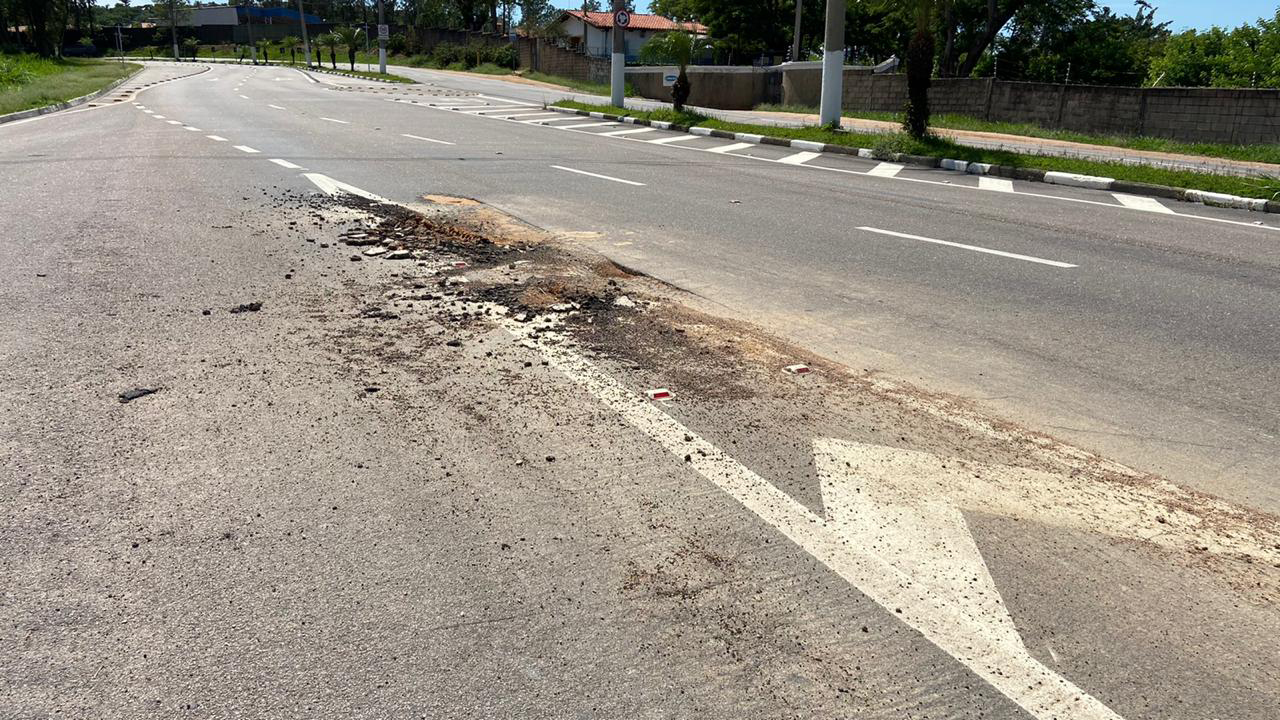 Apenas 5 meses após a finalização das obras na via, surge o primeiro buraco. E não é um buraco pequeno, daqueles que passam despercebidos. É um buraco bem considerável que pega parte do acostamento da faixa de rolamento próximo a primeira rotatória no sentido centro/bairro.
