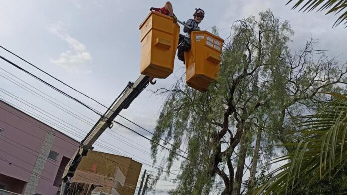 Devido a forte chuva caíram diversas árvore, essa em particular caiu por sobre o muro, quebrando não só a fiação como também o poste padrão.