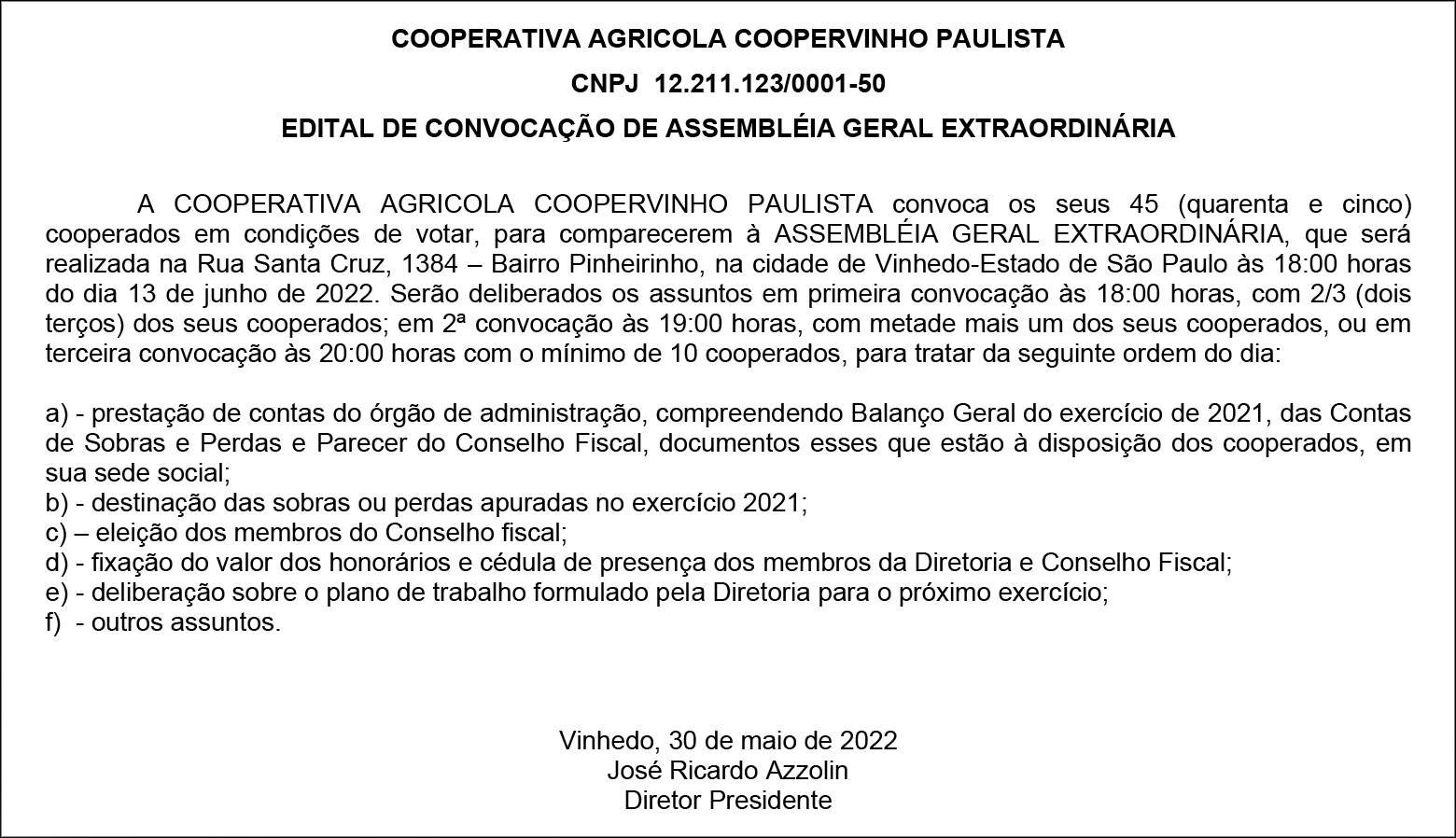 EDITAL COOPERATIVA AGRICOLA COOPERVINHO PAULISTA