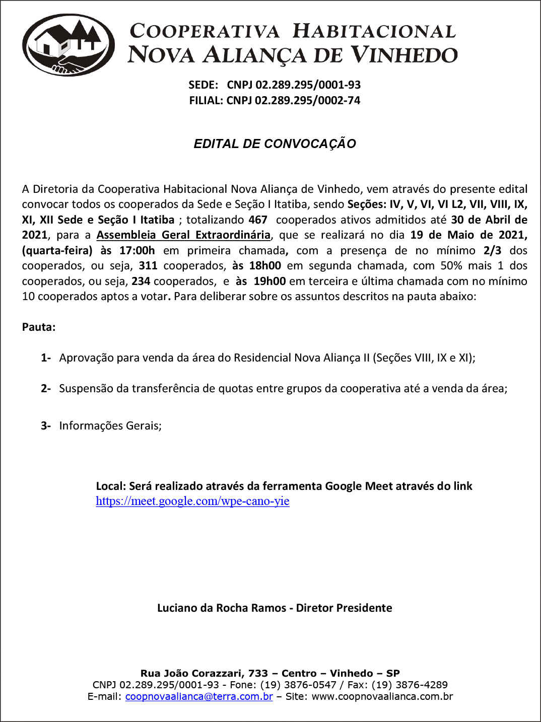 EDITAL DE CONVOCAÇÃO COOPERATIVA NOVA ALIANÇA DE VINHEDO