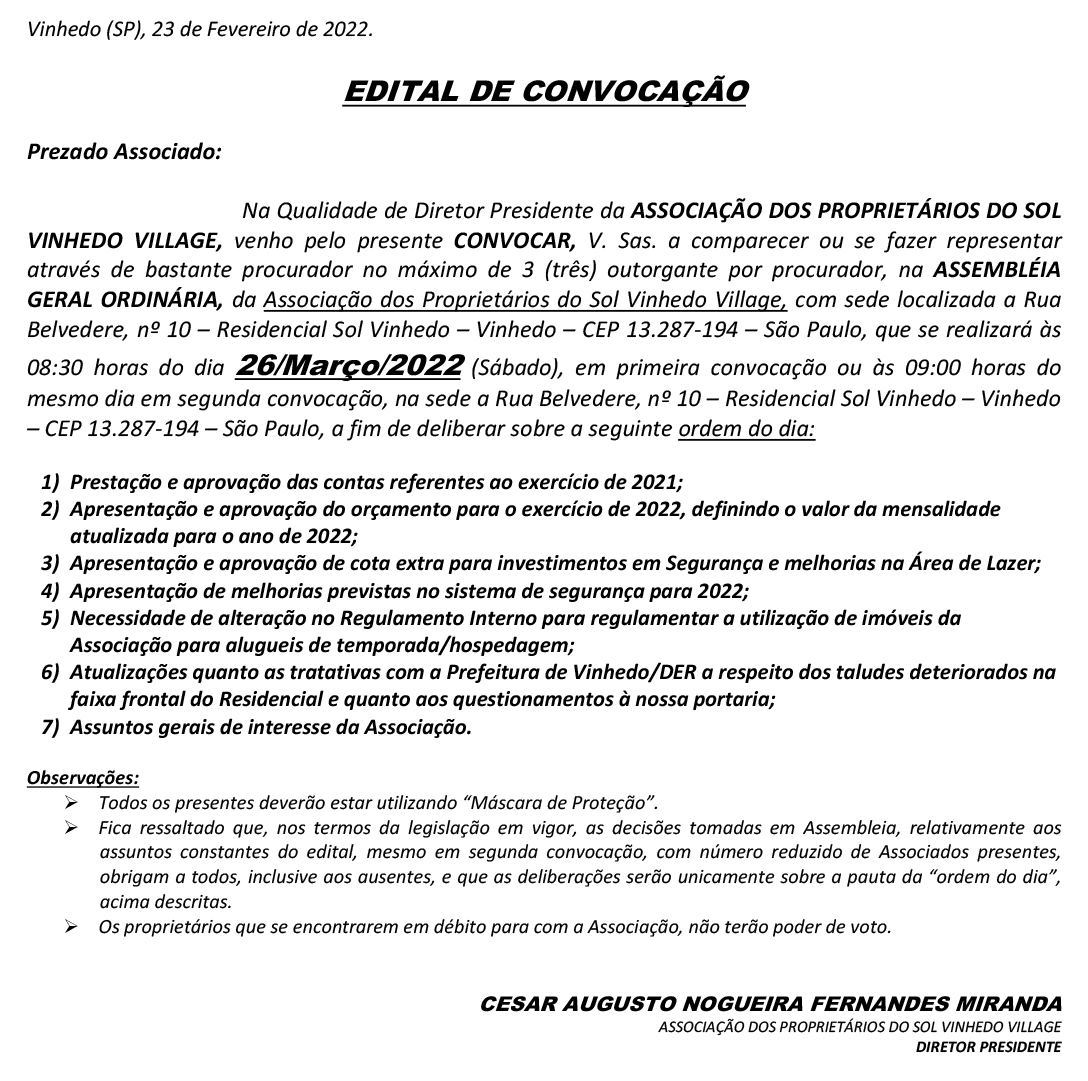 VinhedoEDITAL EDITAL DE CONVOCAÇÃO SOL VINHEDO VILLAGE 25 de fevereiro de 2022 Share FacebookTwitterPinterestWhatsAppLinkedinEmailPrintTelegram propaganda do Google Artigo Top Propaganda do Google Artigo Baixo