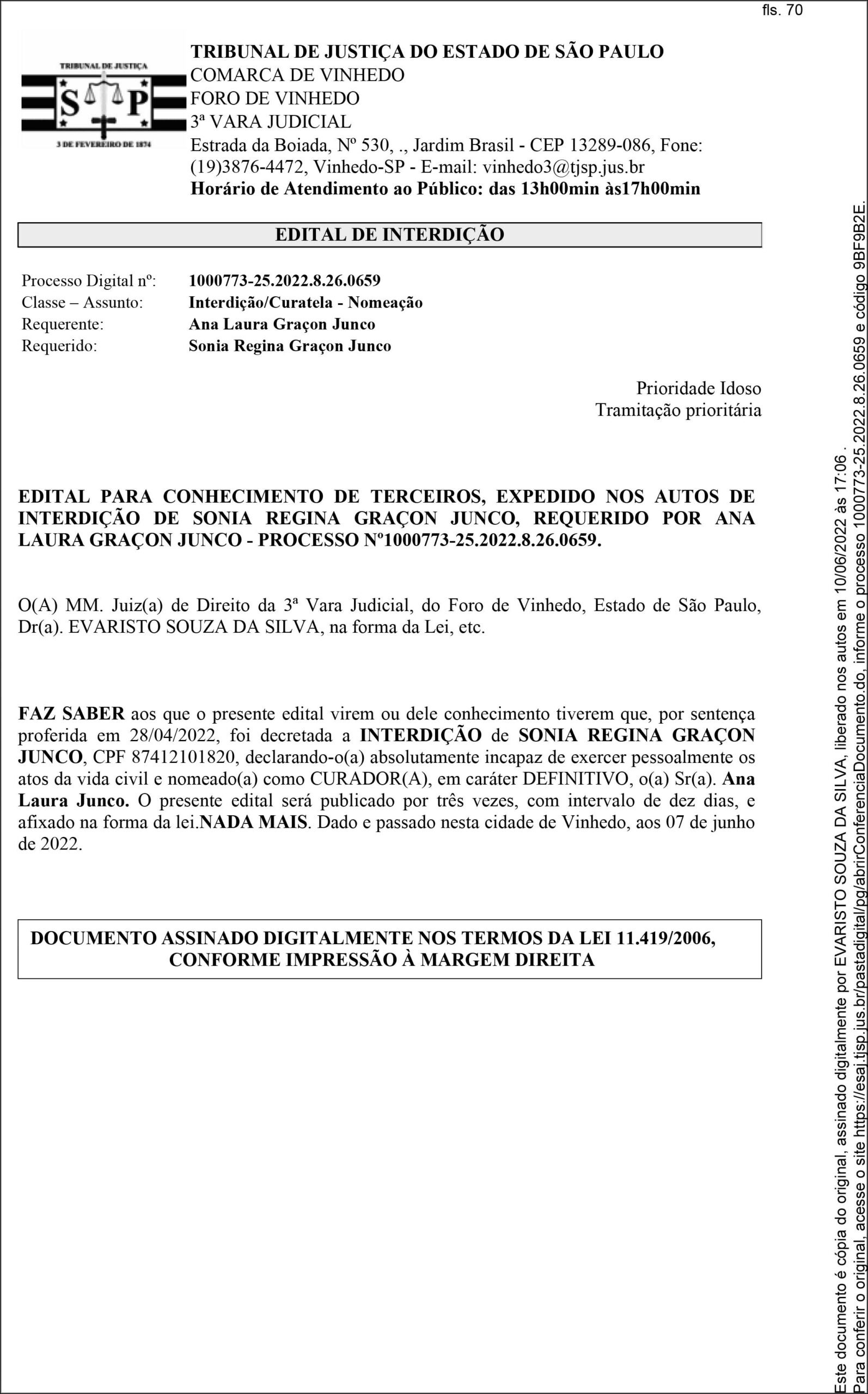 EDITAL DE INTERDIÇÃO DE SONIA REGINA GRAÇON JUNCO
