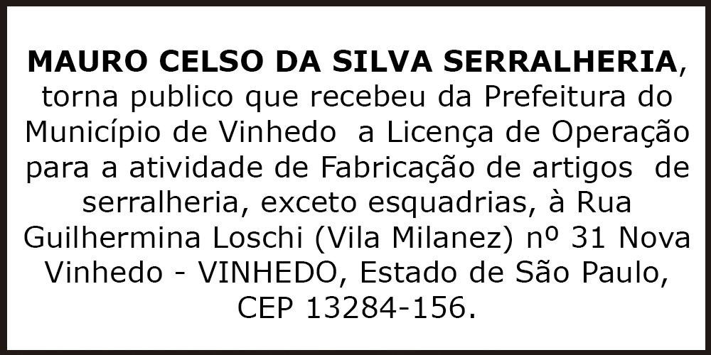 VinhedoEDITAL Edital MAURO CELSO DA SILVA SERRALHERIA 8 de fevereiro de 2022 Share FacebookTwitterPinterestWhatsAppLinkedinEmailPrintTelegram propaganda do Google Artigo Top Propaganda do Google Artigo Baixo