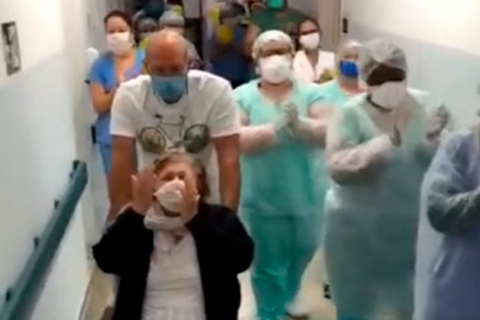 Funcionários da Santa Casa de Vinhedo prestaram uma homenagem a uma idosa, de 69 anos, que teve alta após ser diagnosticada com a covid19, nesta sexta-feira, 1.