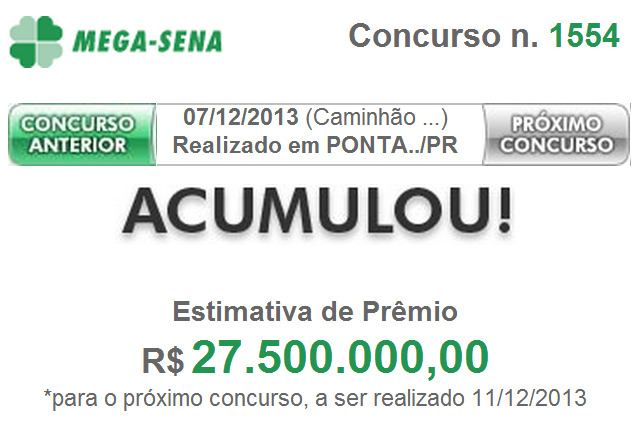 O concurso número 1.554 da Mega-sena, realizado no último sábado, 7, não teve vencedores. O valor do prêmio foi acumulado para o sorteio da próxima quarta-feira, 11. Segundo expectativa da Caixa Econômica, quem acertar as seis dezenas vai levar R$ 27,5 milhões para casa.