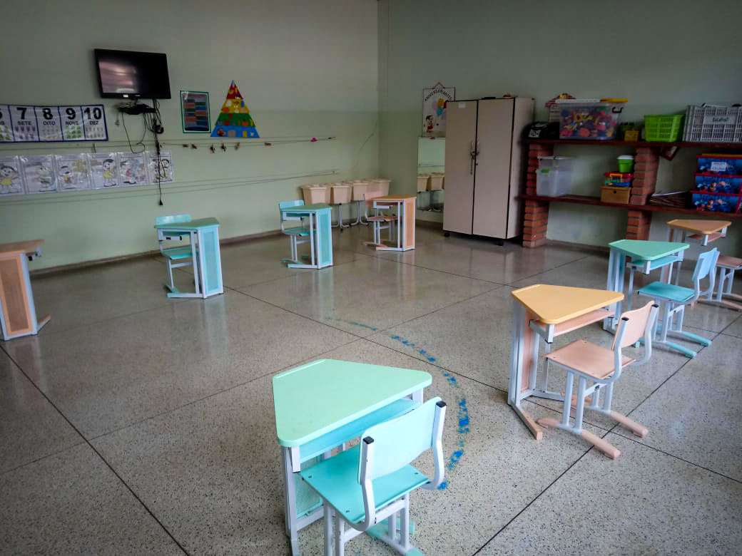 O distanciamento das carteiras deverá seguir a determinação da Secretaria Municipal de Saúde, respeitando a distância mínima de 1,5 metro entre os alunos. Será colocado álcool em gel 70% na porta de entrada e no interior de cada sala. Haverá espaço para guardar os materiais de cada aluno. Nenhum material ou objeto será compartilhado ou utilizado de maneira coletiva.